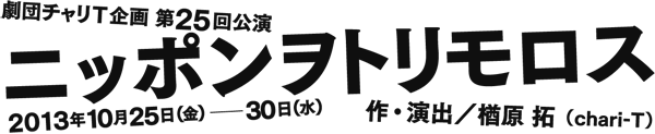 出 演/小杉美香、下中裕子、室田渓人、丸山夏未 他 劇団チャリT企画 、1年4ヶ月ぶりの新作本公演! 「ニッポンをトリモロス(取り戻す)!」と意気揚々の我が国のリーダー。 彼らの「トリモロ」そうとしている「ニッポン」とは一体何なのか!? 「ニッポン」は「トリモロ」せるのか!? なぜ「取り戻す」は「トリモロス」と聞こえるのか? ふざけた社会派・チャリT企画が不真面目ながらも徹底検証! 彼らが夢想する三丁目だか四丁目だかの夕日の果てにある景色をチャリT流に笑い飛ばす ウルトラB級ドタバタ茶番狂騒劇! おいでおいで楽しいよ(^^) ▼スタッフ 照明/伊藤 孝(ART CORE) 音響/島貫 聡 舞台美術/稲田美智子 衣装/久保田早織 舞台監督/森崎美弥子 スチール/鈴木 淳 宣伝美術/BLOCKBUSTER・NO DESIGN 当日運営/横井佑輔(犬と串) 制作/チャリT企画 カンパニースタッフ/teamC.T.K 協力/ウィーズカンパニー、MC企画、椿組 主催:チャリT企画 ========================================================================================= 【一行でないレビュー(ご意見・ご感想)】 ◇10/26(土)15:00 ●このセンス…好きです。(男性・48歳) ●なかなかブラックな感じがよかったですが、国名はもう少しボカした方が良かったかと思います(国としては私も嫌いですが…) 次回作も期待しています。(男性・会社員) ●ブラックかつコメディ、社会風刺もピリッとしてとても楽しかったです。テンポもよく見やすかったです。(年齢・性別不明) ●本当オリンピックどうなるんでしょう。ボランティア3000人あつめるらしいですよ。38度のマラソン人死にますよね。都民、税金出したくないって言ってますよ。(女性・社会人) ●大人しか観てはいけないドリフ、でよろしいでしょうか。あらけずり感が良いです。(男性・43歳・会社員) ●いくつかのアイテムを並べただけで力尽きたか。残念。(男性) ●ジブリ作品を知らないので、周りの笑いがよくわからないところがあった、宅急便のところ。(年齢・性別不明) ●次節ネタわらいました。ボウがない…結局なんだったかよく考えてみます。(男性) ●上映時間一時間というのは非常にテンポが良くて、観ていて中だるみを感じませんでした。(男性・29歳・大学生) ●日本をThe ENDにしてはならない。オリンピックよりほかにやらなければならないことが沢山ある日本、原発は必要悪なのか考えてみます。(男性・65歳・会社員) ●はじめのところから笑ってしまうところが多くて、楽しい時間を過ごせました。(年齢・性別不明) ●ジブリ大好きか!!私も大好きだが!!風立ちぬネタをさっそくぶちこんできたWW 水の演出がすごいと思います。最初は光の演出だと思いましたが、実際に降らせているのでビックリ。キキ、いや危機がビショぬれww風邪ひかないで!! 支配人と従業員のかみあわないトークがシュールすぎて楽しかった!(年齢・性別不明) ●あまり意味がわかりませんでした。(年齢・性別不明) ●少しシュールでまだちょっと消化できていないので、感想などの形にまとめられないのですが… やぶ水道屋さんのキャラが立っててそれはわかりやすかったです。あの過激な3人組が誰の風刺にあたるのか(首相???)(年齢・性別不明) ◇10/27(日)15:00 ●今回初めて拝見しましたが、ちょっと内容とタイトルがアンバランスな気がしました。そのためどう評価して良いかわからないです。とりあえず次回公演を見て判断したいと思います。(男性・45歳・会社員) ●これは、ひどい。(男性・33歳) ●とてもシンプルで面白かった。ドリフネタや70年ネタは特によかった。(男性・31歳) ●いつもよりテンポがゆっくりだった気がする。次の会話が出てくるまで、まちが長い気が…。最後のガチャガチャでチャリTらしさが出て良かった。(年齢・性別不明) ●結構まどろっこしい間合いがあり、少々イラっと感じたところあり、終わり方が級でわかりにくかったです。 お水、たいへんでしたね。おつかれさまです。(年齢・性別不明) ●今話題となっている事柄を取り上げているのが新鮮で驚きでした。見ていて何だかなつかしい印象をもちました。今後ともがんばって下さい。(女性・57歳・主婦) ●もう少し、暗喩的な、楢原さんらしい頭脳明晰さ振りを拝見したかった!(女性・58歳・主婦) ●ブラックコメディで面白かった。特に松本さんと内山さんのからみが自然な感じで実際に会社にいそうで良かった。(年齢・性別不明) ●最初から最後まで面白かったです。あと30分くらい長くやって頂きたかったです。支配人の電話の受け答え、特に面白かった。(年齢・性別不明) ●おもしろかった、また見にいきたい。(女性・10歳・小学生) ●王子小劇場がこんなに水びたしになってるの初めてみました(笑)一時間に色んなことモリモリで、アレ?一時間でおわっちゃうんだ…と感じました。 最後まで、カゼひかないように気をつけて下さい(笑)(女性・27歳・アルバイト) ●(1)想像を超えた不謹慎さ。SPECの結末より驚き(多分)。 (2)屋台崩し、ときたか。 (3)前半部はちょっと冗長、かつ、たいくつか